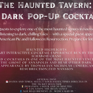 The Haunted Tavern: A Dark Pop-Up Cocktail Experience allows guests to explore one of the most haunted venues in Knoxville while sipping on themed cocktails and listening to dark, chilling tales — with a special guest appearance by Thomas Ian Nicholas, actor from American Pie and Halloween: Resurrection. Prepare for lots of spooky surprises! Highlights ✨ Step into a 4-part interactive cocktail experience run by the descendants of Ichabod Crane 🍸 Sip on themed cocktails in one of the most haunted venues in Knoxville 😱 Learn about the ghost of Annapolis and hear other dark, chilling tales 🎬 Special guest appearance by Thomas Ian Nicholas (American Pie, Halloween: Resurrection)